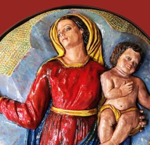 Nella foto la Ceramica dell’artista Marco Silecchia che raffigura la Madonna del Rosario presente nella facciata della Chiesa del Rosario di Via XX Settembre.