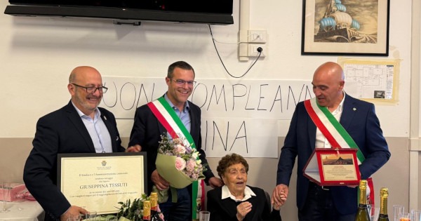 La signora Giuseppina Tessuti ha compiuto 100 anni martedì scorso. Nata il 21 aprile 1026, ha festeggiato il compleanno attorniata dai suoi parenti e dal personale della casa per anziani di Fertilia, dove è ospite. Ad augurarle buon compleanno, il Sindaco Raimondo Cacciotto e il Presidente del Consiglio Comunale Mimmo Pirisi, con un omaggio floreale e una pergamena. La signora Pina si è trasferita ad Alghero da Burgos nei primi anni sessanta. Ha svolto in città e nelle borgate la professione di insegnante fino all’età della pensione. Moltissimi suoi alunni la ricordano con affetto e non hanno fatto mancare gli auguri di buon compleanno. Presenti alla festa anche il Sindaco di Burgos Leonardo Tilocca accompagnato dal vice Salvatore Sechi.